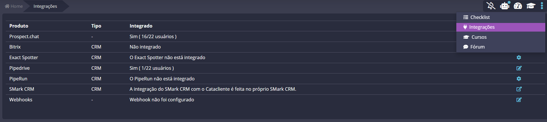 Em Integrações, o status aparecerá como Integrado.